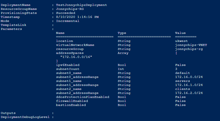 New-AzureRmResourceGroupDeployment -Name TestJonnychipzDeployment -ResourceGroupName Jonnychips-RG -TemplateFile template.json -TemplateParameterFile parameters.json