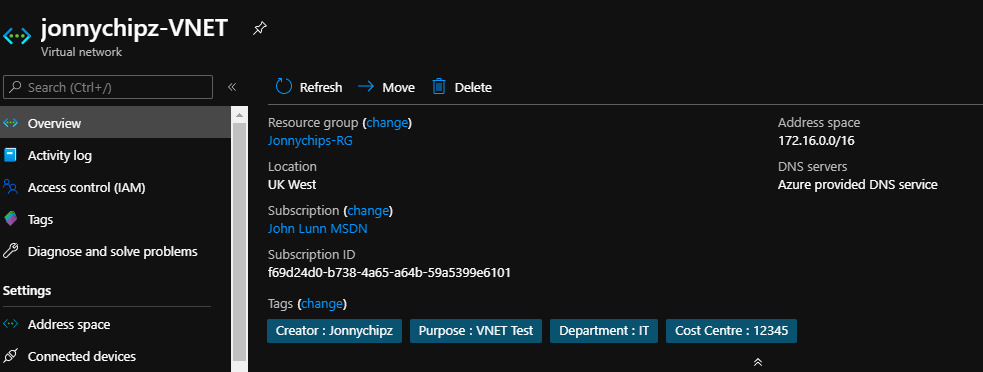 3. Next we will check we are happy with which subscription we are going to store the VNET in, create a new Resource group ‘Jonnychipz-RG’ and give the VNET a name ‘Jonnychips-VNET’ as well as selecting a Region ‘UK West’. This gives us our BASIC configuration.