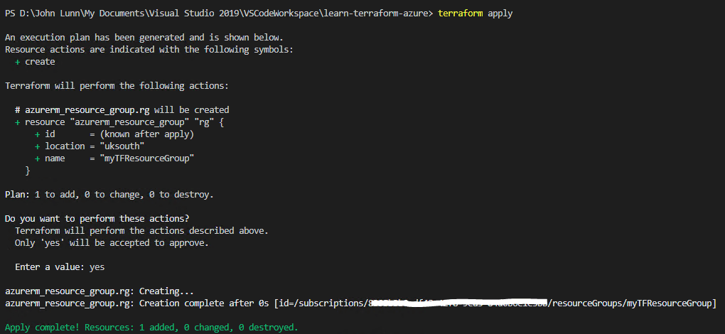 We can see that the output in greed confirms we have 1 resource added. If we log on via the Azure Portal, here we can see our newly created resource group: