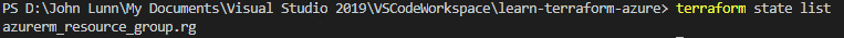 If we had a long state file, we can use the command ‘terraform state list‘ which gives us a list of resources: