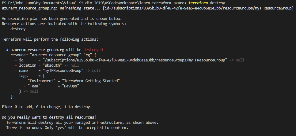 Therefore utilising the ‘terraform destroy‘ command we can do just that: