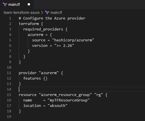 This code is set to create us a new Resource Group in our Azure Subscription named ‘myTFResourceGroup’ and it will be created in the Uk South Datacentre.