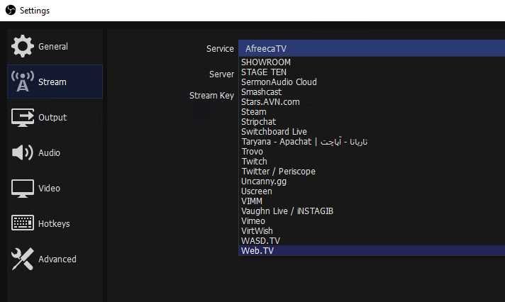 So if we select, Twitch, this implies you have a Twitch account and you can get a copy of the stream key, which is essentially like a secret that your OBS software knows to give Twitch when t starts streaming so Twitch knows which account it needs to display the stream to!