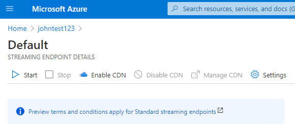 Next lets ensure that the default Streaming Endpoint is started (note that this is where you can enable a CDN to ensure your media is available to the nearest source for your global audience!)