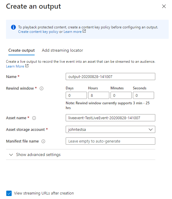We create our output to store our copy of the live stream to enable users to rewind and reply our stream for up to 8 hours, this data is held in a storage account, we also create a locator that describes how our stream can be played back by our users: