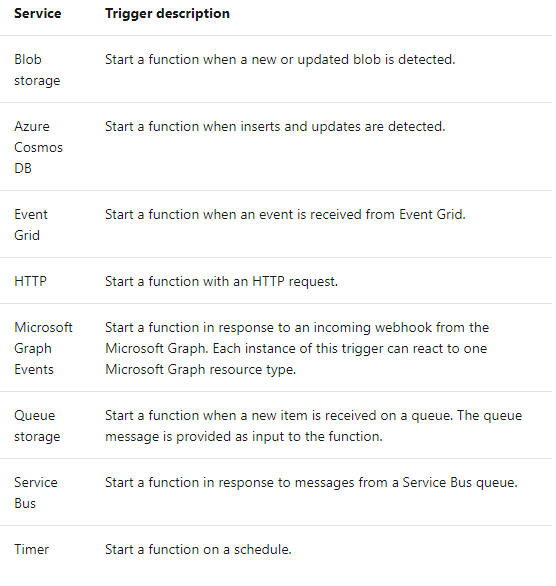 Functions are driven by Events, which basically means that a function runs in response to a given event. Typically these Events are called ‘Triggers’. Azure has many different supported Triggers across various Azure Services: