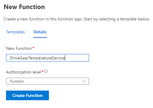 Next we give the function a name and select ‘Function’ as the Authorisation Level: