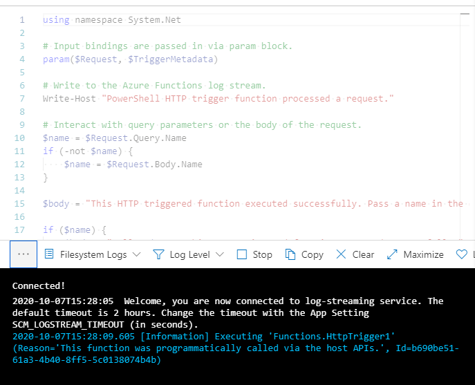 This PowerShell code expects a name to be passed through either the HTTP request query string, or the request body. HTTP functions generate output by writing to the output binding. In PowerShell ‘Push-OutputBinding’ cmdlet is utilised for this purpose.