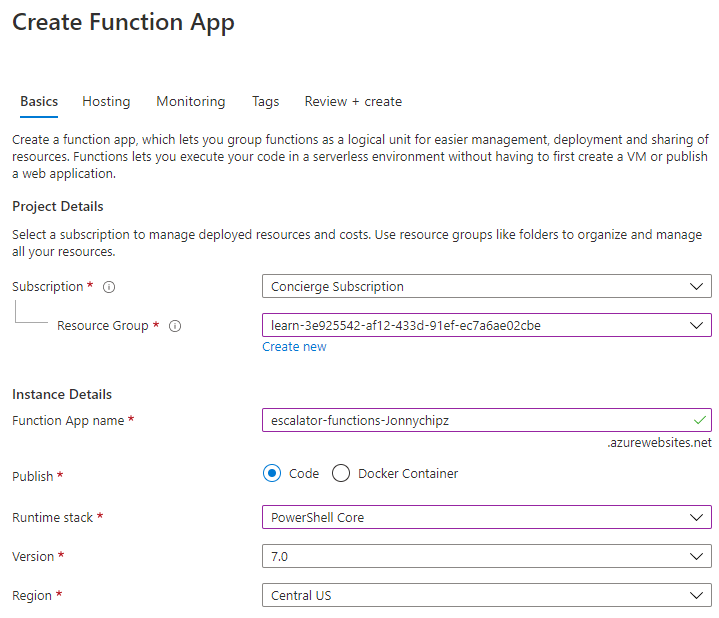 Next we Select the Subscription, Resource Group and give the Function App a name. We will choose PowerShell Core as our runtime stack: