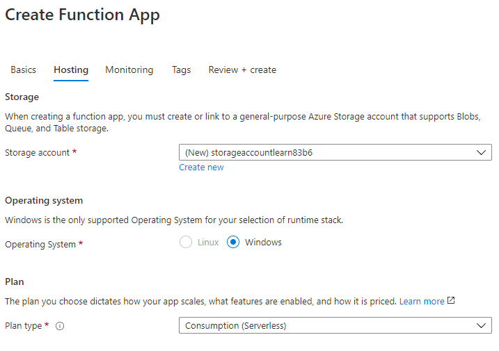 On the hosting tab, we just need to create a new storage account, Ensure that the OS is set to Windows and select the Consumption(Serverless) as the Plan type: