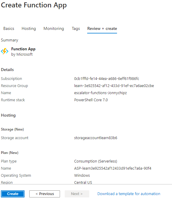 Once the configuration has been verified we can go ahead and create our Function App:
