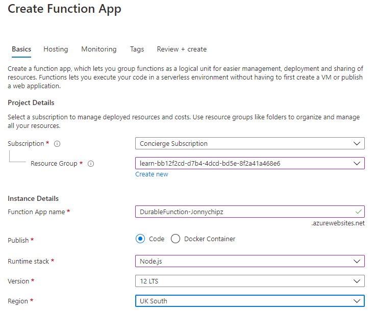 First we create our Function App: