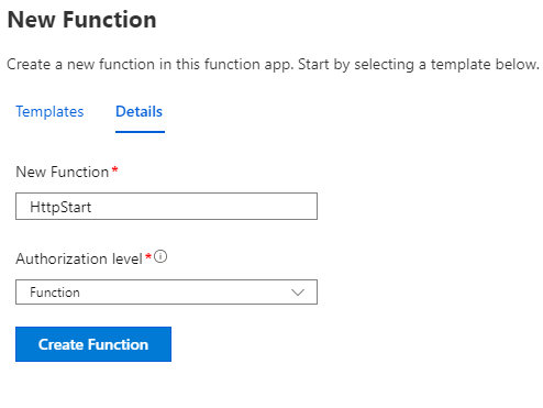 Name the function and select Function as the Authorisation level:
