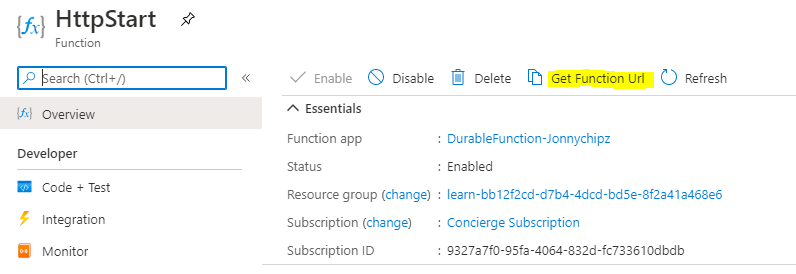 Select the Function ‘HttpStart’ and get the function URL: