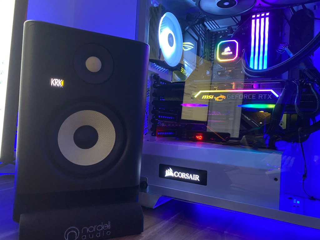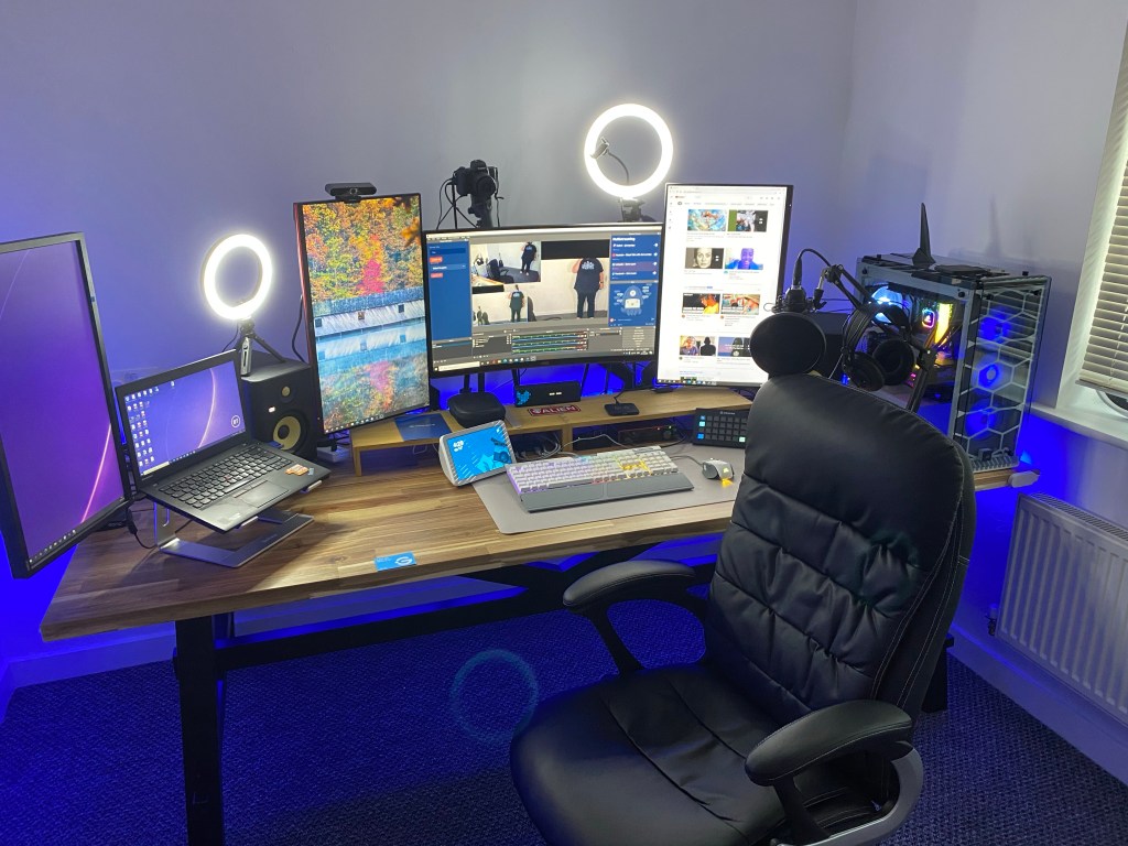 The vertical monitor and thinkpad on the left is the work rig, hooked up to a KVM, with the Canon EOS just creeping in, Ive moved that more central now. a Rokit KRK studio monitor. Then we have the 27 Vertical AOC Monitor, 32 Curved AOC and the other 27 Verticle capped of with the other Rokit KRK Monitor and the AMD/ROG Beast!