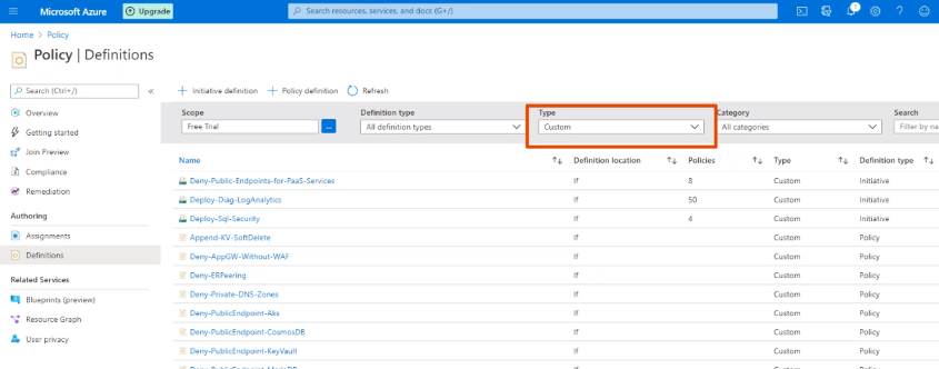 So, we have two options when it comes to Policy Definitions, Built in, or Custom.