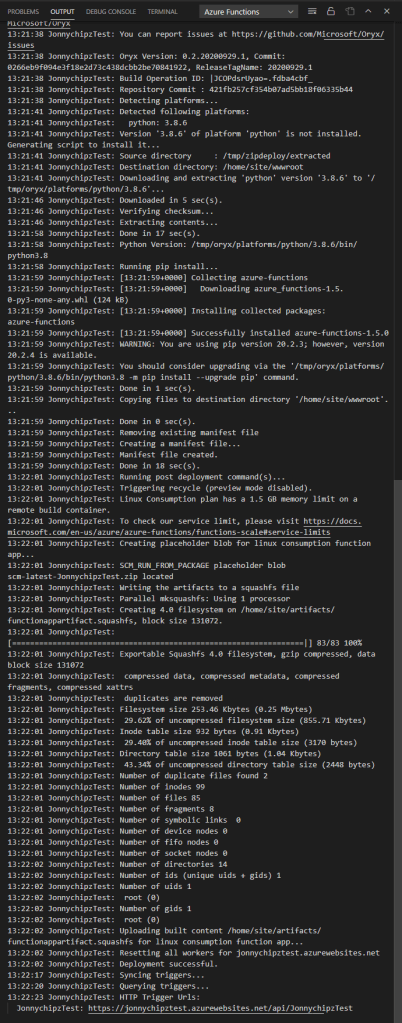 - Press F5 to call the function and start the app project. The output from the core tools is displayed in the Terminal panel.