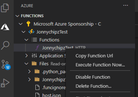 - Back in the Azure: Functions area in the side bar, expand the new function app under your subscription. Expand Functions, right-click (Windows) or Ctrl on JonnychipzTest, and then choose Copy function URL.
