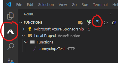 - Choose the Azure icon in the Activity bar and then in the Azure: Functions area click on the Deploy to function app… button.