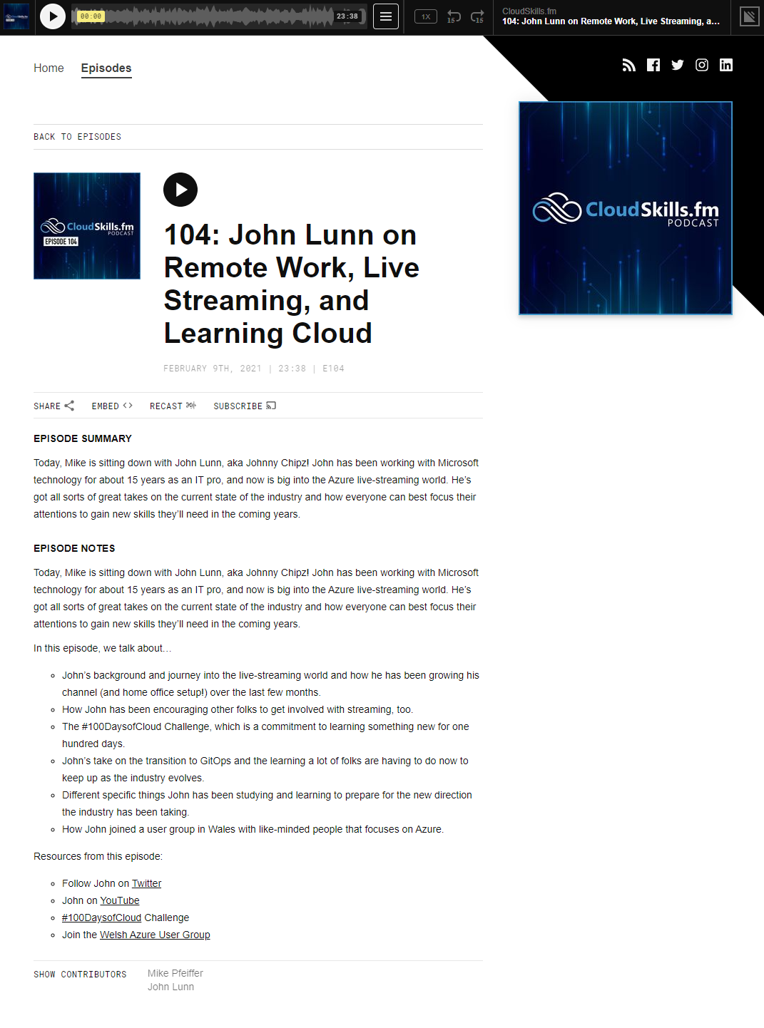 Huge thanks to Mike Pfeiffer for inviting me onto the Cloudskills.fm podcast to discuss my Cloud Journey, you can check it our here: ✅ https://cloudskills.fm/104