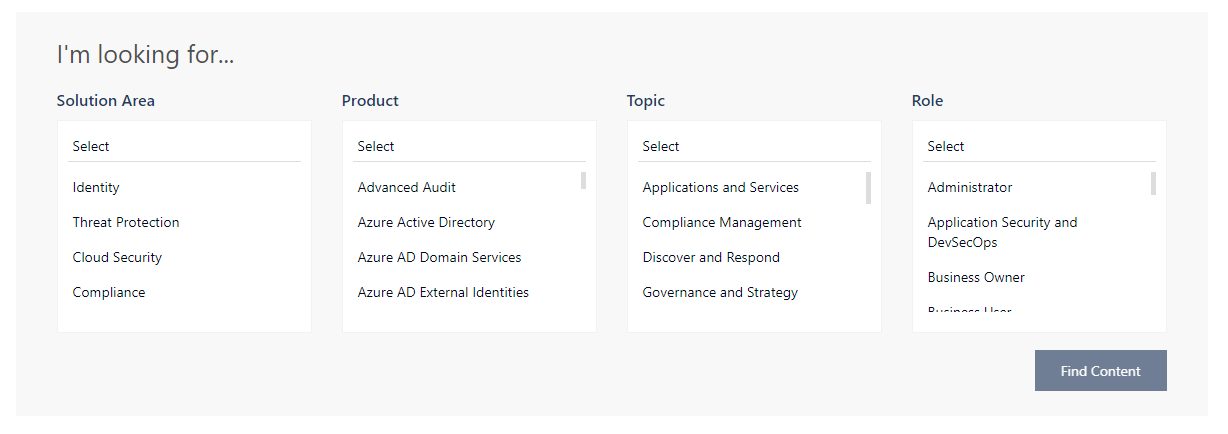 This Library can be utilised to search for content related to Security, Compliance and Identity across both M365 and Azure. You can utilise the selections to filter based on solution area, product, topic, role, technical depth and type of content.