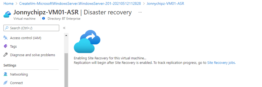 Once your VM has been crated, if you check the Disaster Recovery Tab under ‘Operations’ you will see that ASR will be enabled and Replication to your secondary region will commence: