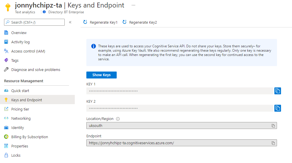 Under ‘Resource Management‘ Click on Keys and Endpoint, here you will find the Key that you can copy for use later in this article.