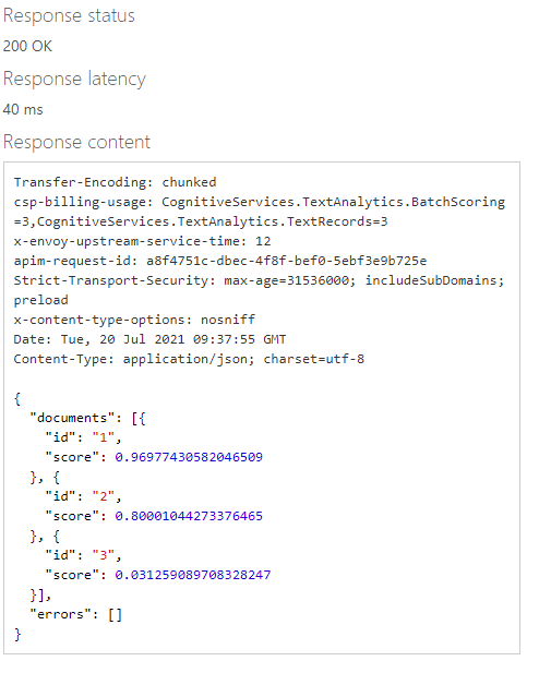 OK So on the testing web page, we can format a request body to include three pieces of text for analysis: